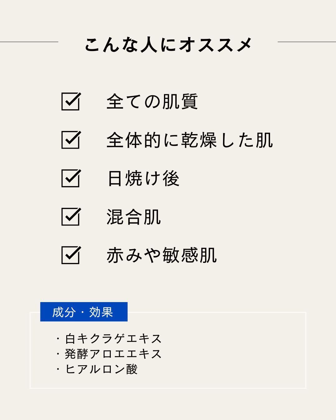 水、グリセリン、ジプロピレングリコール、ベタイン、ブチレングリコール、スイカズラ花エキス、アラントイン、ガラクトミセス発酵液、アカマツ葉エキス、ヒドロキシエチルセルロース、(アクリレーツ/アルキル(C10-30)アクリレート)クロスポリマー、アルギニン、ステアリン酸ソルビタン、香料、1,2-ヘキサンジオール、センチフォリアバラ花エキス、カミツレ花エキス、ジャスミンエキス、カニナバラ果実エキス、フヨウ花エキス、ウンシュウミカン果皮エキス、サウルスエキス、ドクダミエキス、スイカズラ殻エキス、アッケシソウエキス、ビフィズス菌発酵液、EDTA-2Na、グリセリルアクリレート/アクチニル酸コポリマー、プロピレングリコール、ラクトバチルス/アロエベラ発酵濾液、ショウブ根エキス、シソ葉エキス、ペンチレングリコール、ブチレングリコール、ヒアルロン酸ナトリウム、シロキクラゲ(キノコ)エキス