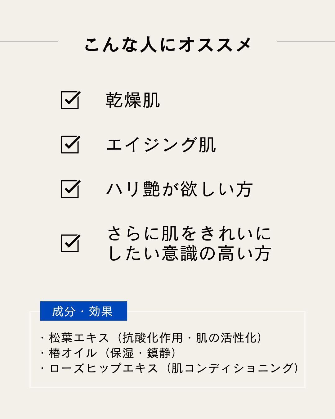 松葉エキス(抗酸化作用・肌の活性化)、椿オイル(保湿・鎮静)、ローズヒップエキス(肌コンディショニング)