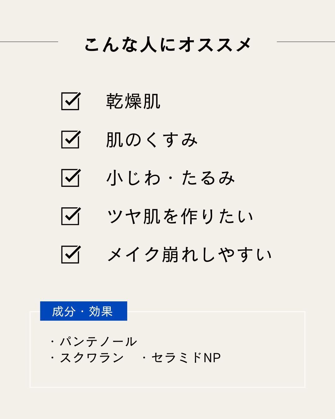 水、スクワラン、グリセリン、炭酸ジカプリリル、セチルPEG/PPG-10/1ジメチコン、1,2-ヘキサンジオール、硫酸Mg、ラウリルPEG-9ポリジメチルシロキシエチルジメチコン、ヒドロキシアセトフェノン、パンテノール、BG、EDTA-2Na、ジャノヒゲ根エキス、セラミドNP、DPG、スベリヒユエキス、フィトスフィンゴシン、水添レシチン、カプリリルグリコール、ステアリン酸グリセリル、セラミドAS、セラミドAP、セラミドNS、コレステロール、ニンジン葉/茎エキス、グリシン、トリペプチド-1銅、セラミドEOP