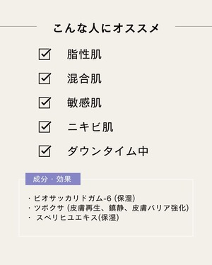 ビオサッカリドガム-6 (保湿), ツボクサ (皮膚再生、鎮静、皮膚バリア強化), スベリヒユエキス(保湿)