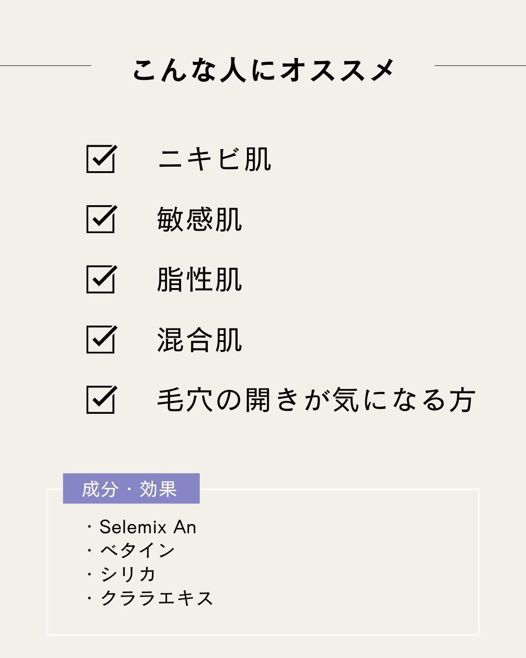 Selemix An(スキンコンディショニング、保護、鎮静、角質除去、リサーフェイシング、引き締め、セラムバランシング)、ベタイン(抗シワ)、シリカ(コラーゲンブースト)、クララエキス(スキンコンディショニング)