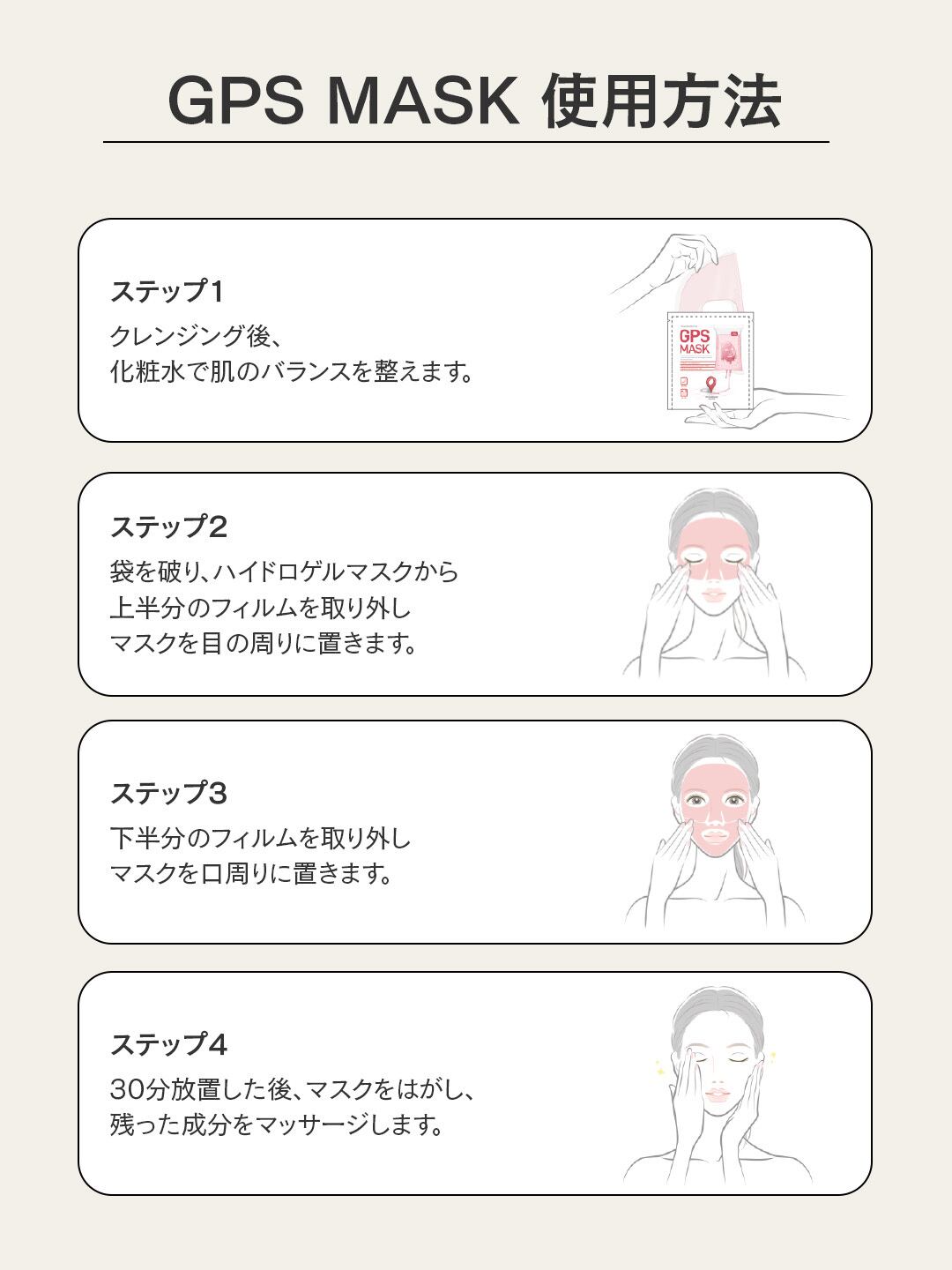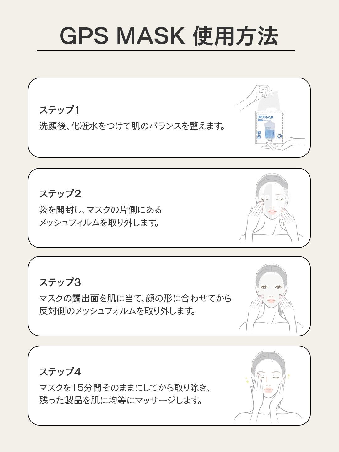 STEP4:マスクを15分間そのままにしてから取り除き、残った製品を肌に均等にマッサージします。