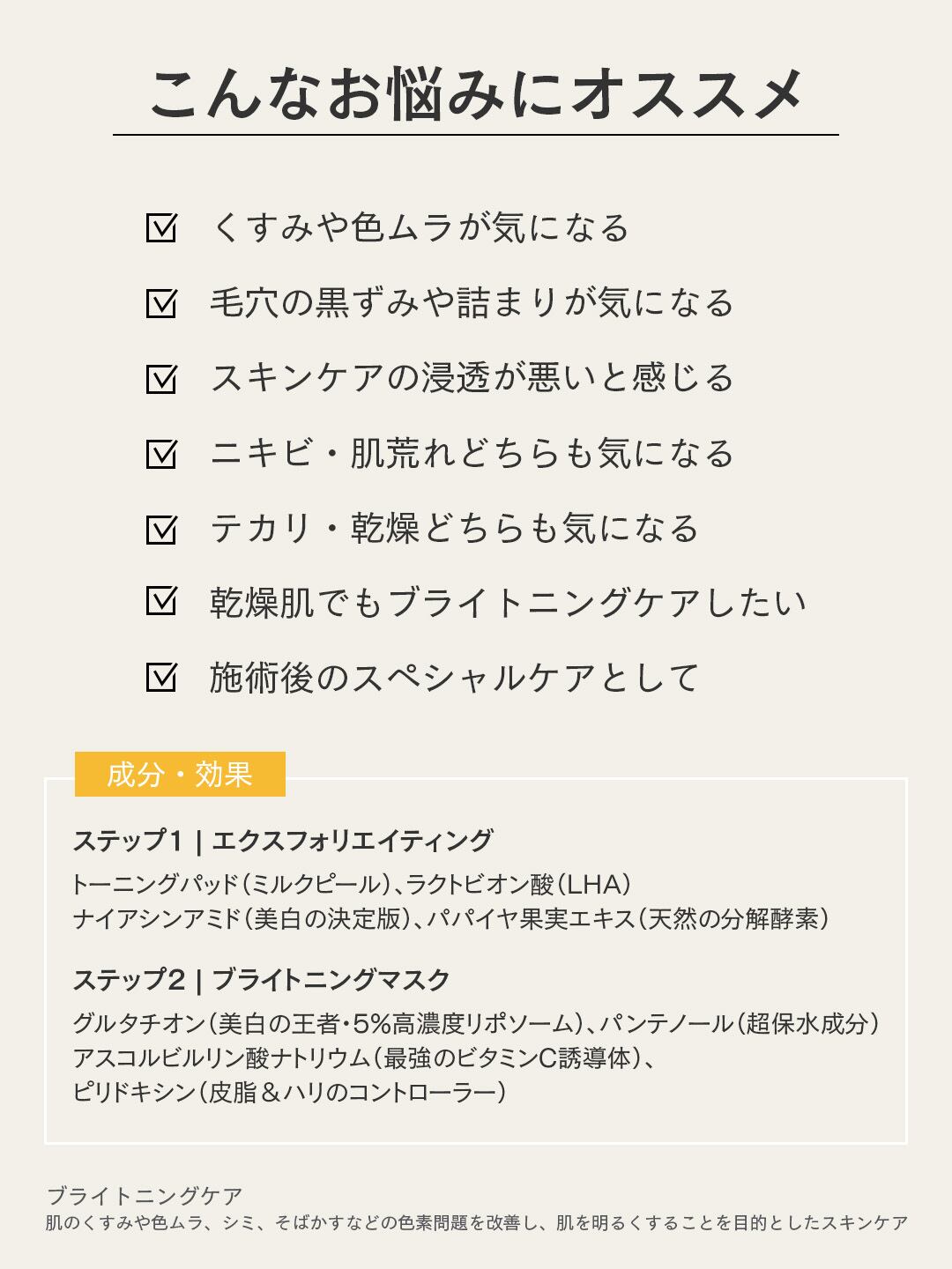 ・角質除去トーニングパッドとブライトニングマスクのセットで、透明感あふれる肌へ導きます。