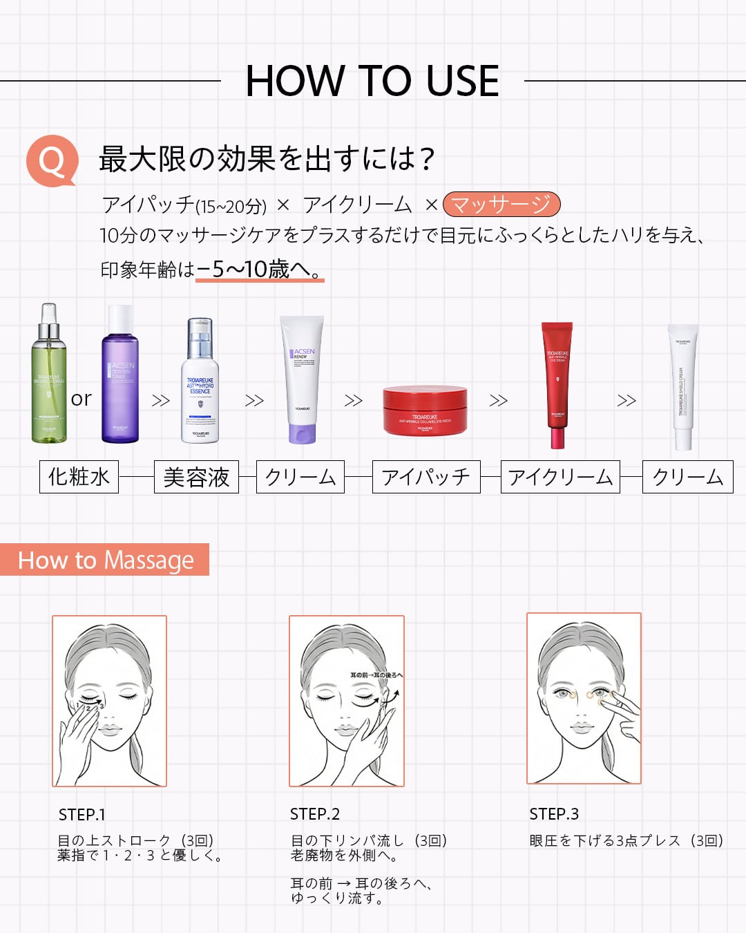 →リニュークリーム後、①パッチ(15-20min)②アイクリーム適量を馴染ませる→シールドクリーム