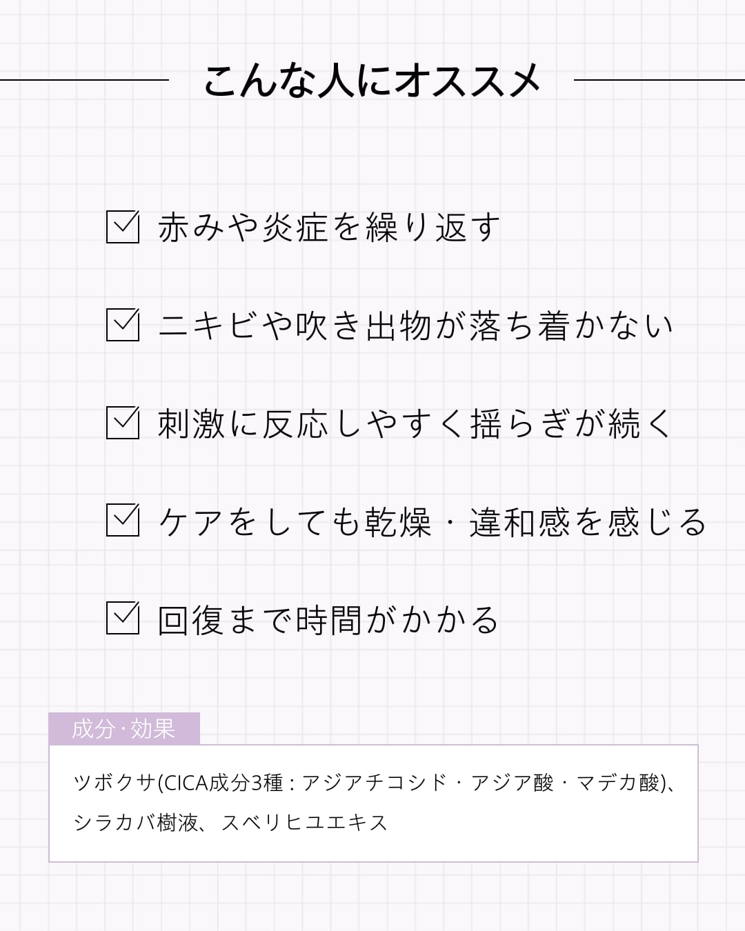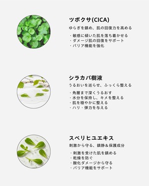 カーミングに特化したツボクサ由来のエキスです。肌荒れを防ぎ、トラブルのない健やかな状態に保ちます。