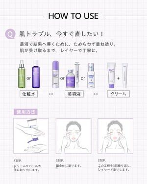 敏感肌やトラブルの多い肌を考え、肌のバリア機能に着目した処方。皮膚科学的に刺激がない※ことが確認されています。軽めの保湿クリームやデイクリーム、ナイトクリーム前のエッセンスとしてもお使いいただけます。