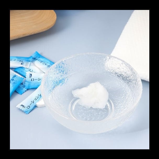 ①化粧水を化粧水のキャップなどに注ぎ、シートを1個入れます。